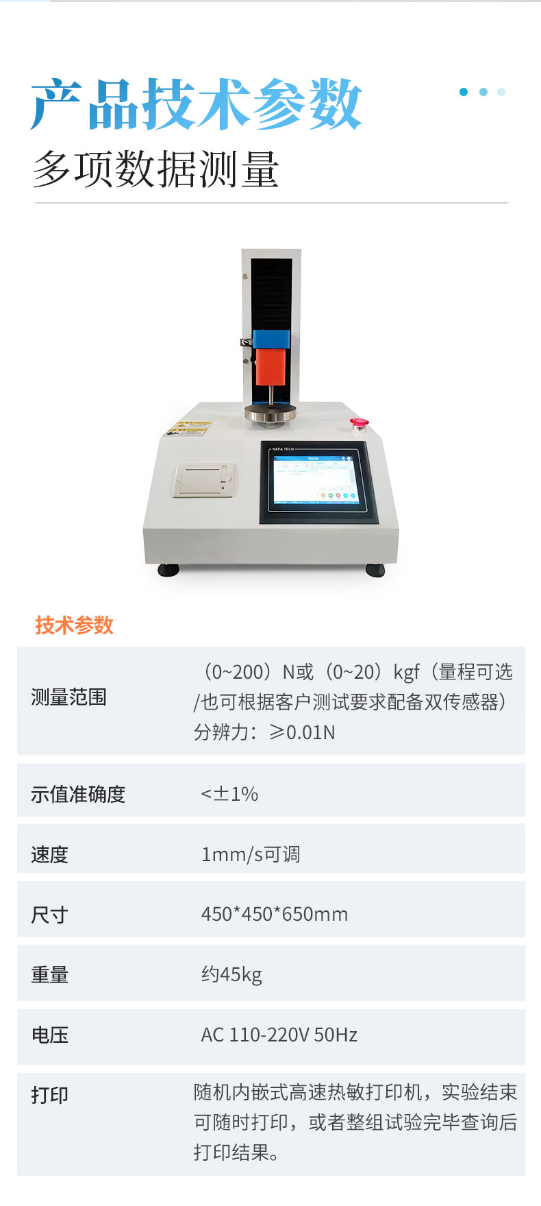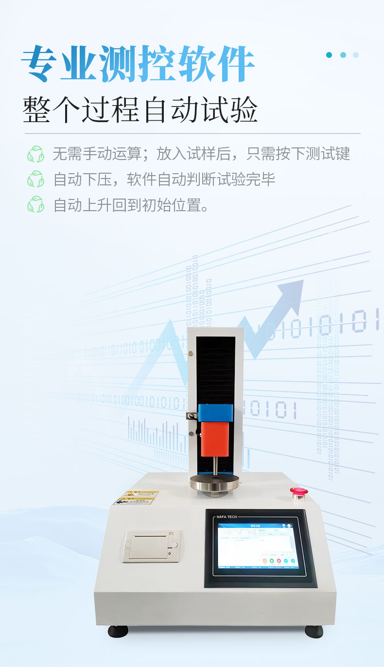 7、軟件:專業(yè)測(cè)控軟件,整個(gè)過(guò)程自動(dòng)試驗(yàn),無(wú)需手動(dòng)運(yùn)算;放入試樣后,只需按下測(cè)試鍵,自動(dòng)下壓,軟件自動(dòng)判斷試驗(yàn)完畢,自動(dòng)上升回到初始位置。
