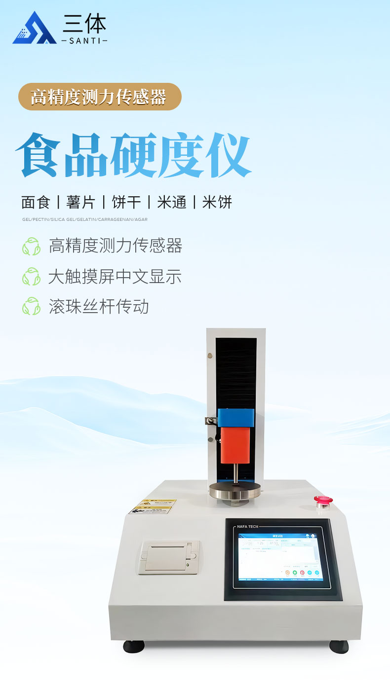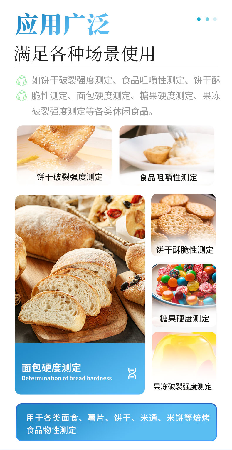 食品硬度儀適用于各類面食、薯片、餅干、米通、米餅等焙烤食品物性測(cè)定,如餅干破裂強(qiáng)度測(cè)定、食品咀嚼性測(cè)定、餅干酥脆性測(cè)定、面包硬度測(cè)定、糖果硬度測(cè)定、果凍破裂強(qiáng)度測(cè)定等各類休閑食品。