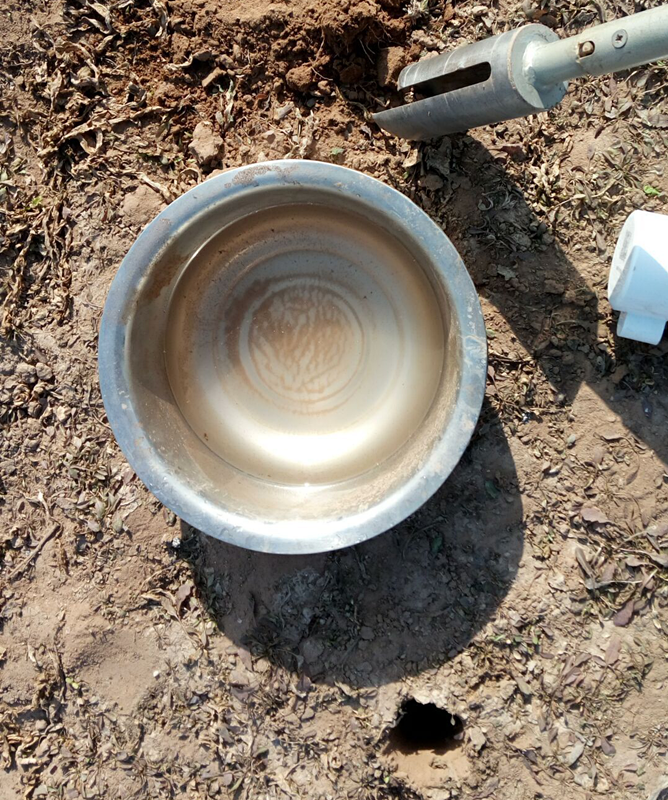 b. 將取土鉆從孔洞中取出,放到盆子里,用工具把鉆出的土收集到盆子里以用來和泥漿。(注意:初次鉆土因為雜質過多,不做收集)
