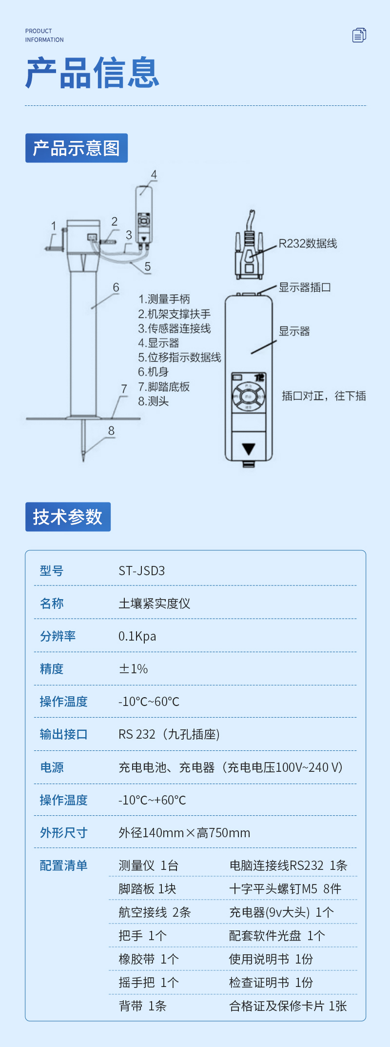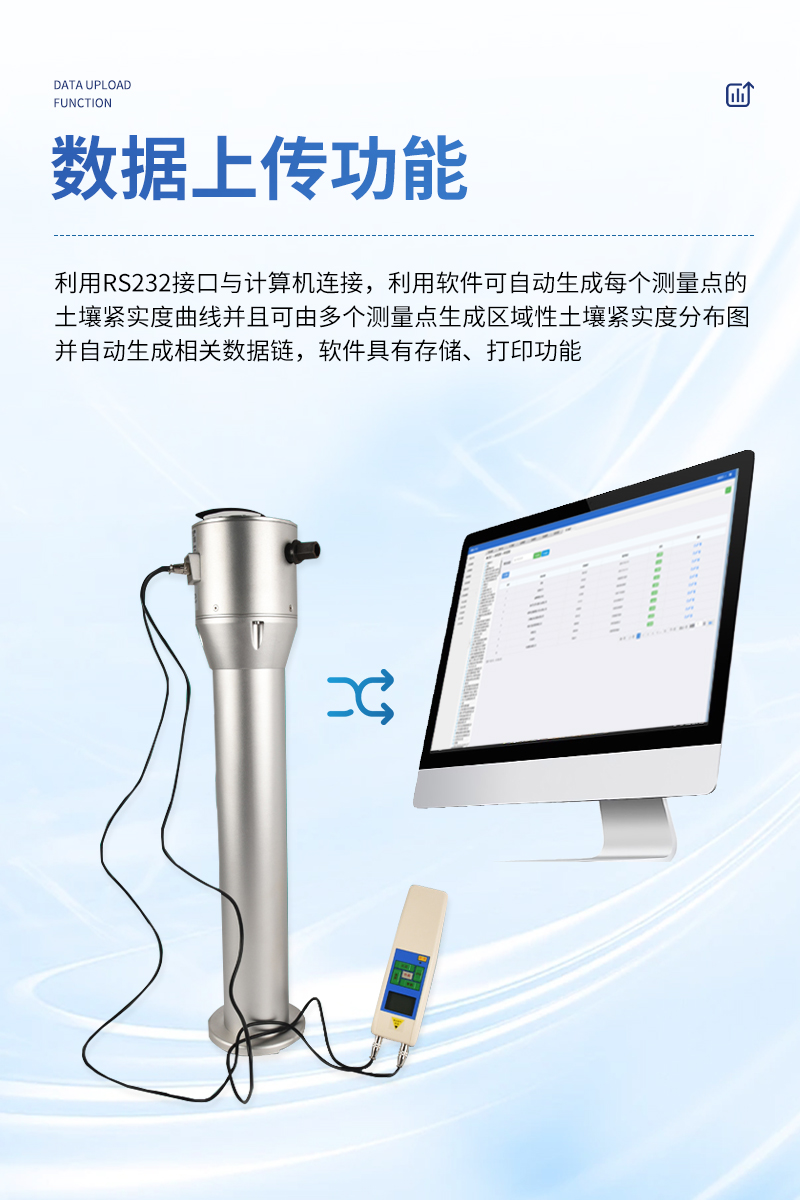 具有數據上傳功能:利用RS232接口與計算機連接,利用軟件可自動生成每個測量點的土壤緊實度曲線并且可由多個測量點生成區域性土壤緊實度分布圖并自動生成相關數據鏈。軟件具有存儲、打印功能。