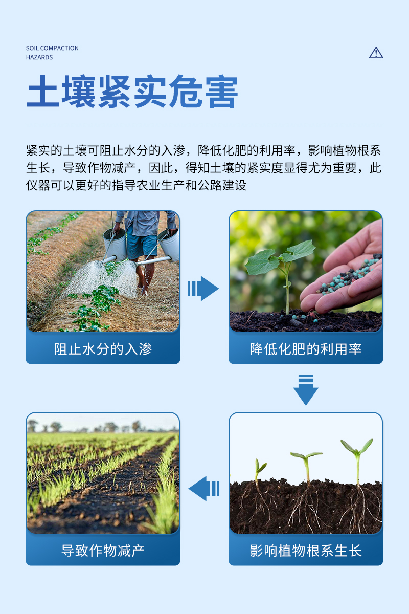緊實的土壤可阻止水分的入滲,降低化肥的利用率,影響植物根系生長,導致作物減產。因此,得知土壤的緊實度顯得尤為重要,此儀器可以更好的指導農業生產和公路建設。
